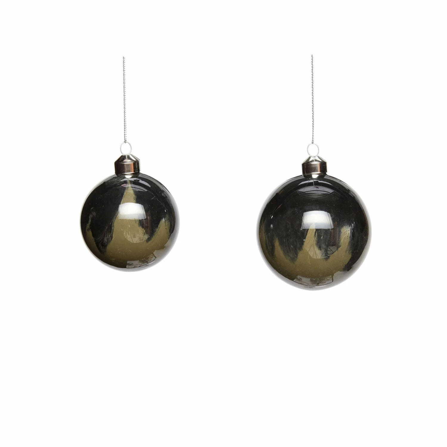 Wonderful set of 2, fabulous tree ornaments. Made from glass and striking with a metallic finish, these gorgeous baubles will catch the light beautifully on a christmas tree, wreath or table setting. The set of 2 consists of two sizes, one of each size and the colour can be described as a olive / gold and brown / black top. Hand finished, these beautiful tree ornaments are completely individual, so the pattern and colour may vary slightly – only adding to the character and charm.