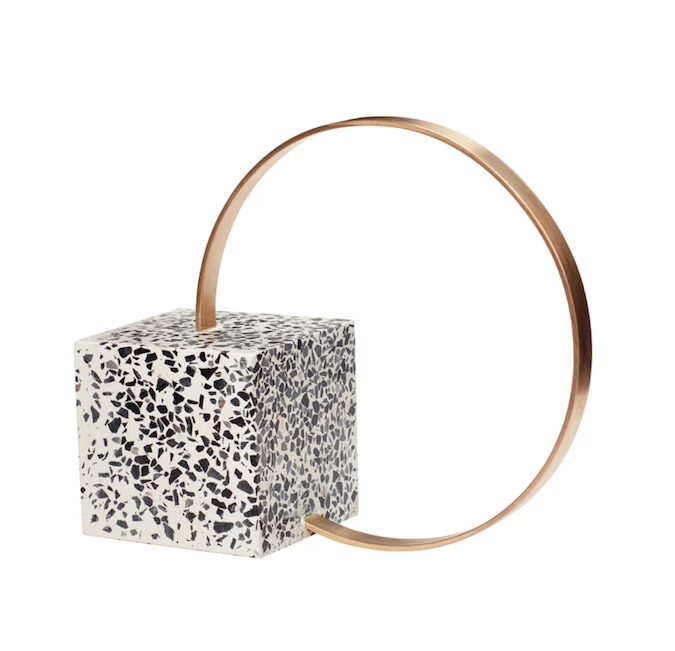 Original y escultural sujetalibros de la marca danesa Hübsch. Fabricado con materiales muy actuales y en tendencia: base en terrazo blanco y aro metálico en latón. En su conjunto, forman una pieza que, además de práctica, ya que funciona de sujetalibros, puede resultan tan estética y decorativa que puedes colocarla en cualquier lugar, estanterías, aparador, vitrinas, aparador o mesas auxiliares. En cualquier rincón del hogar dará un toque original y fresco.