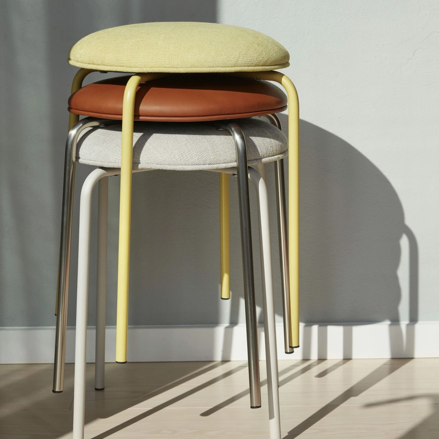 This small but mighty stacking stool is light, compact and beautiful. Don’t compromise on style or space, this stool is perfect for visitors and is a small space saviour. Made from a sturdy but lightweight iron and finished in a shiny nickel colour, the legs are finished with a curve and have buffers on the bottom to protect your floor. The faux leather pad is easy to keep clean and is cushioned for extra comfort. The tan brown and nickel finish had a modern, cosmopolitan feel that will fit in any home. Sit alone or stack with stools alike, 3 colours available.