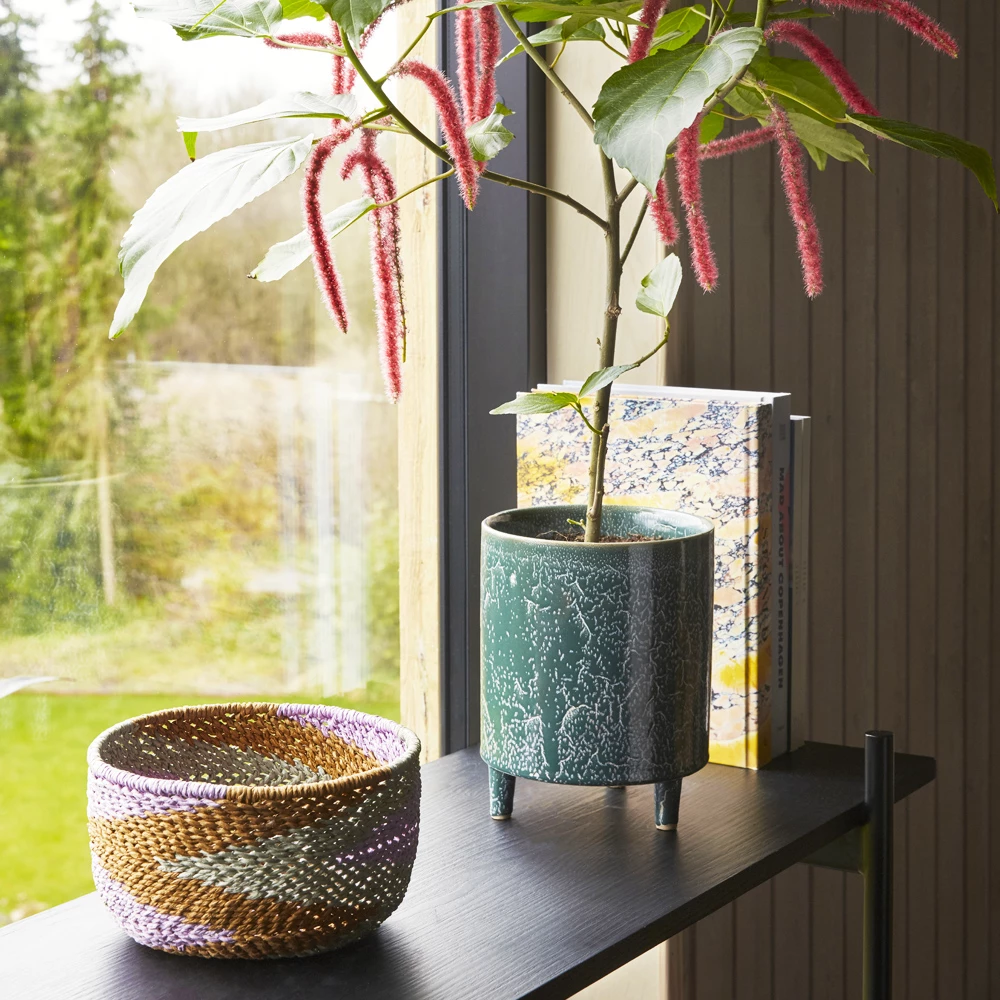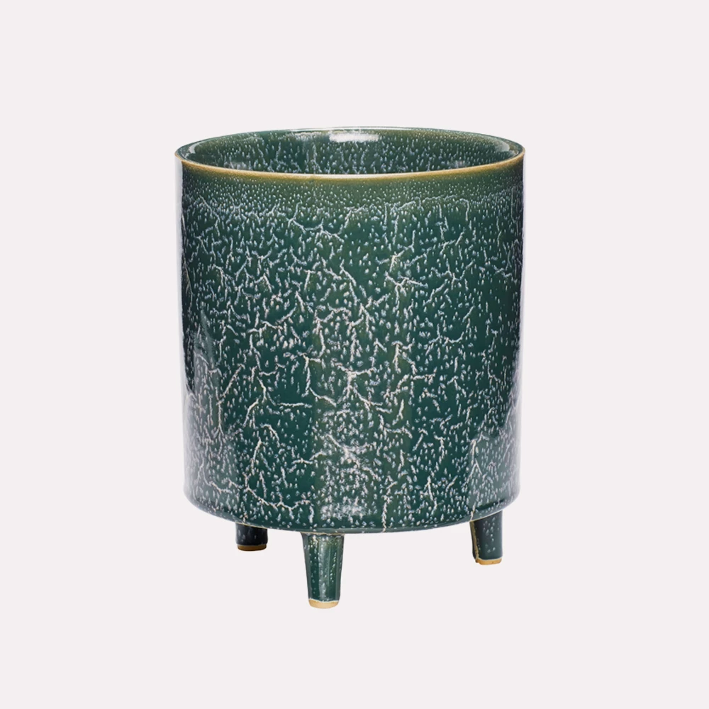 The STAND pots for plants in bottle green ceramic enhance the plants and flowers placed inside. The design is cylindrical and its characteristic legs add a special touch to the design, as does the spectacular enamel with a crackle finish. STAND is completely waterproof and has no drainage hole, a perfect pot for any type of plant.