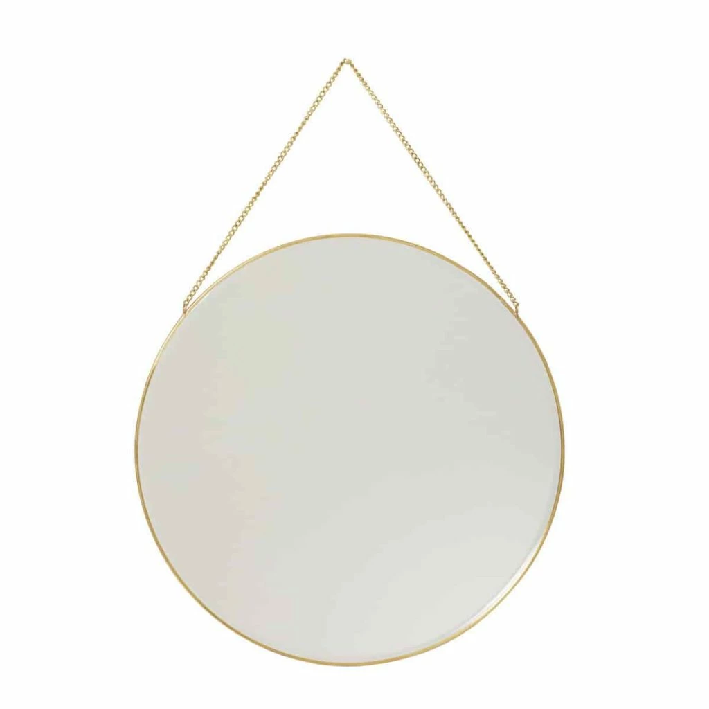 El espejo redondo Golden con su color latonado y su cadenita colgante es muy fino y elegante. Nos encanta para colocarlo en un tocador, en la entrada de casa o un rinconcito del salón.