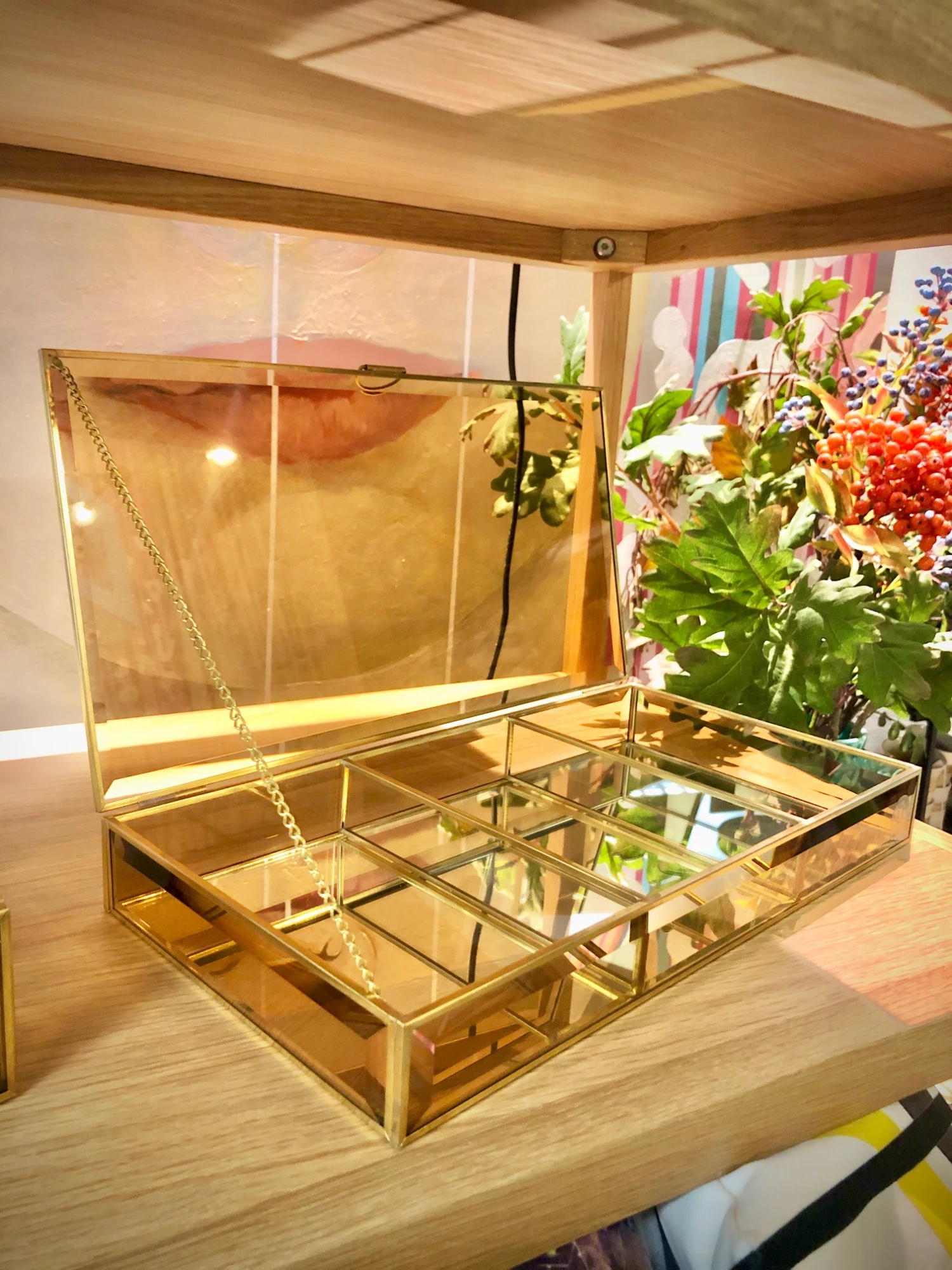 Rectangular box made of brown glass with brass profiles. Each glass has a small viselate on all its faces. The box is suitable for keeping small objects in their three different compartments. This piece can work both in areas of desks to organize pencils and stationery items as in dressers for jewelry, on shelves, …The base is mirrored, so it makes it even more luminous and special.