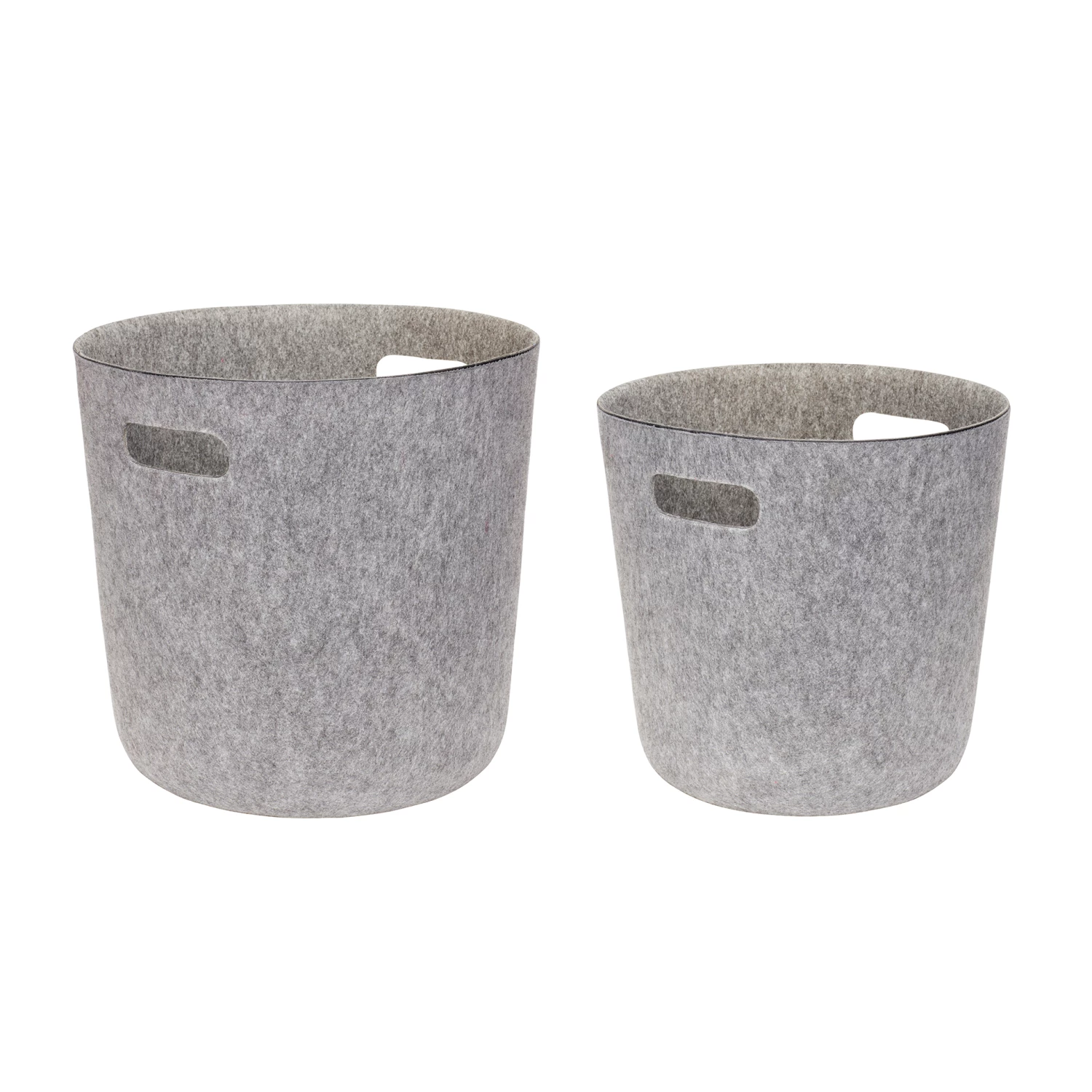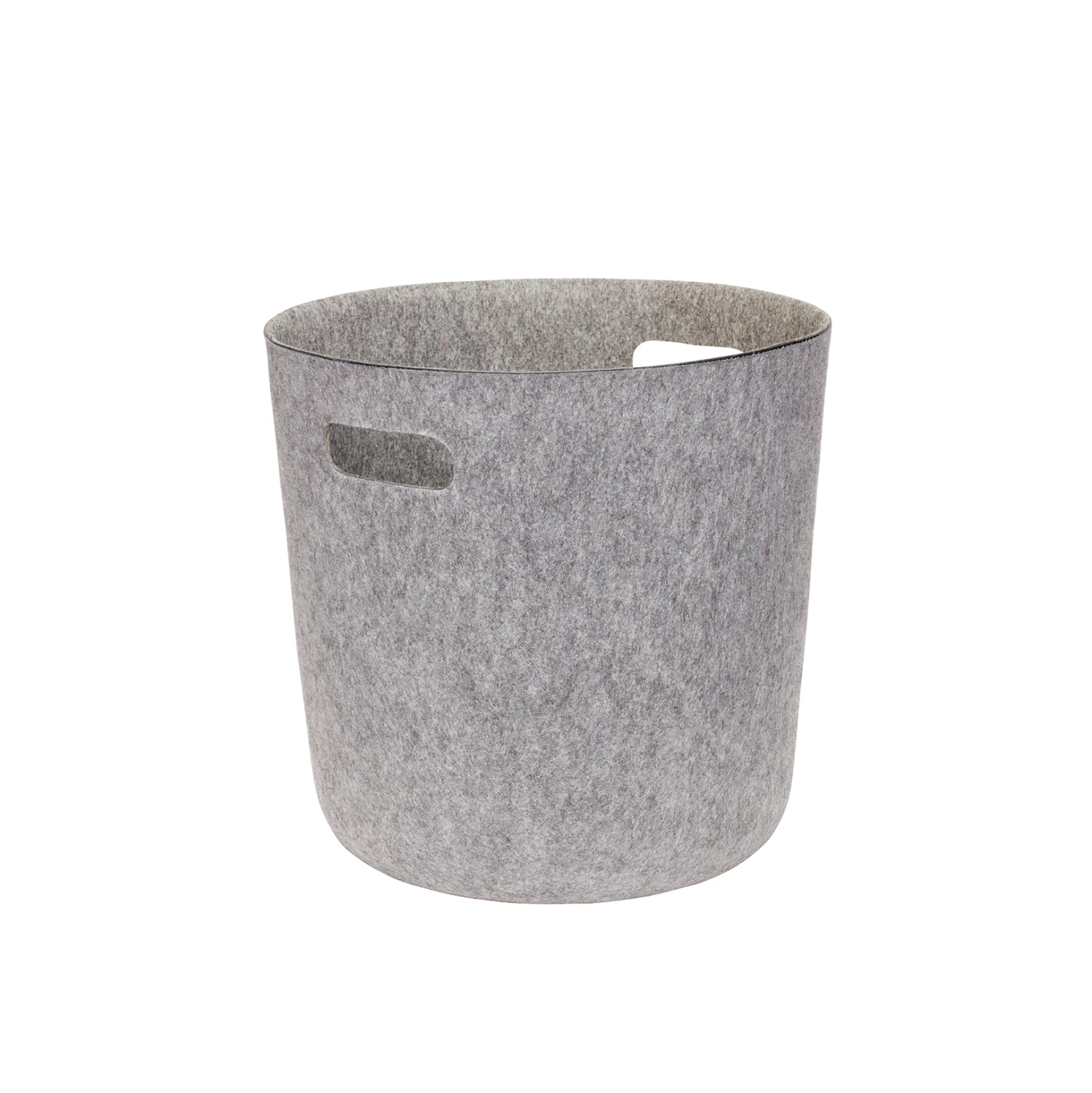 The grey round storage basket is perfect in the office or living room. The soft felt material feels luxurious and is environmentally friendly. Cutout handles allow easy grips in moving the basket around.