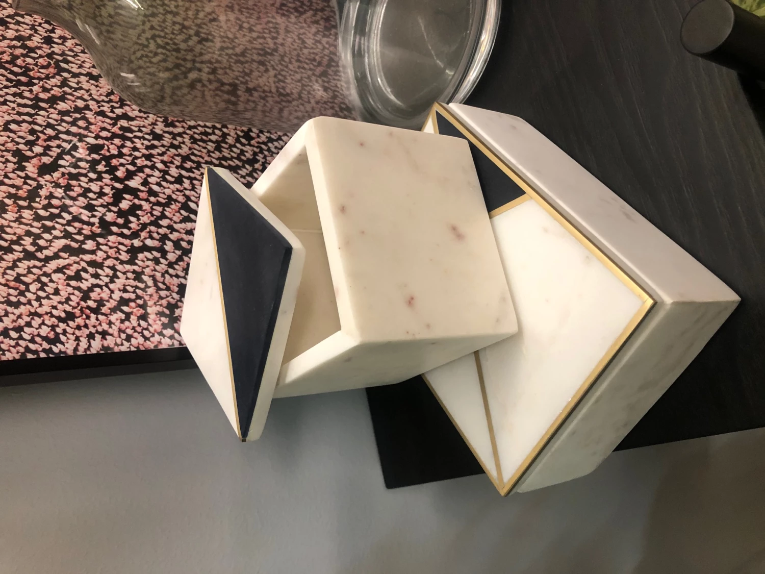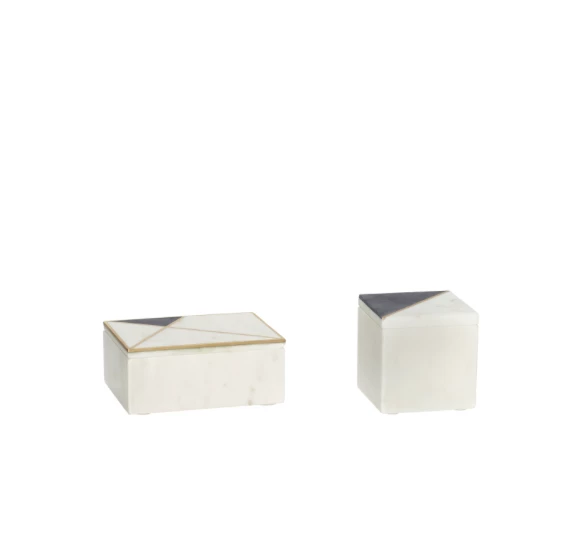 Set of two boxes of different sizes, made of marble with a lid decorated with geometric patterns based on brass and blue. They are ideal as jewelry boxes on a dressing table, keys on any entrance dresser, as decoration on a coffee or auxiliary tables, shelves …