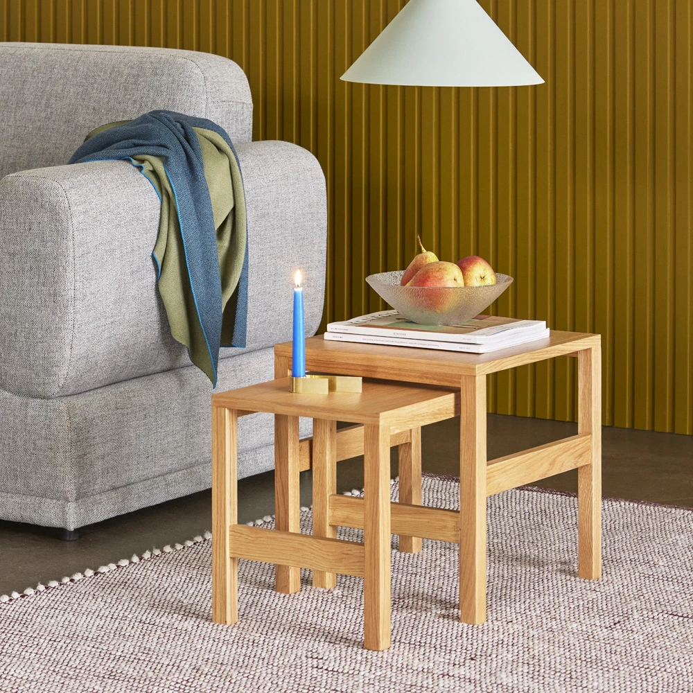 This set of two nested oak wood side tables has a sleek, minimalist aura. Use them both together and separately, as side tables for the sofa or as coffee tables. The tables are handcrafted from FSC-certified oak veneer and assembled with precious fixtures that elevate their elegance and style.