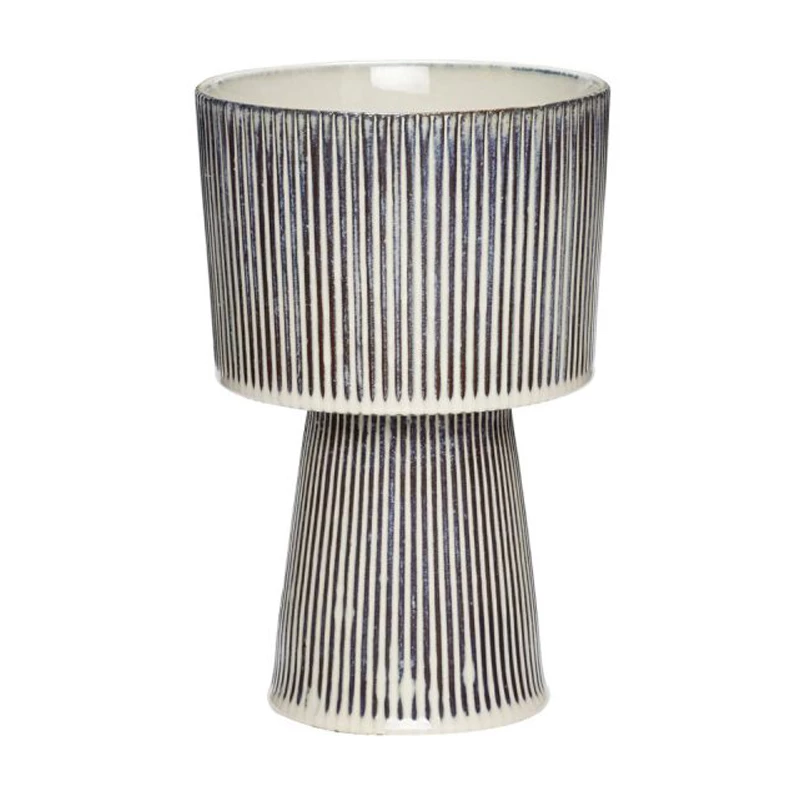 These graphic, geometric planters are perfect to add a bit of height and drama to your houseplants. The pots are made from ceramic and have a striking beige and black pinstripe pattern to compliments green plants as well as bright flowers This product is handmade and may therefore variate.