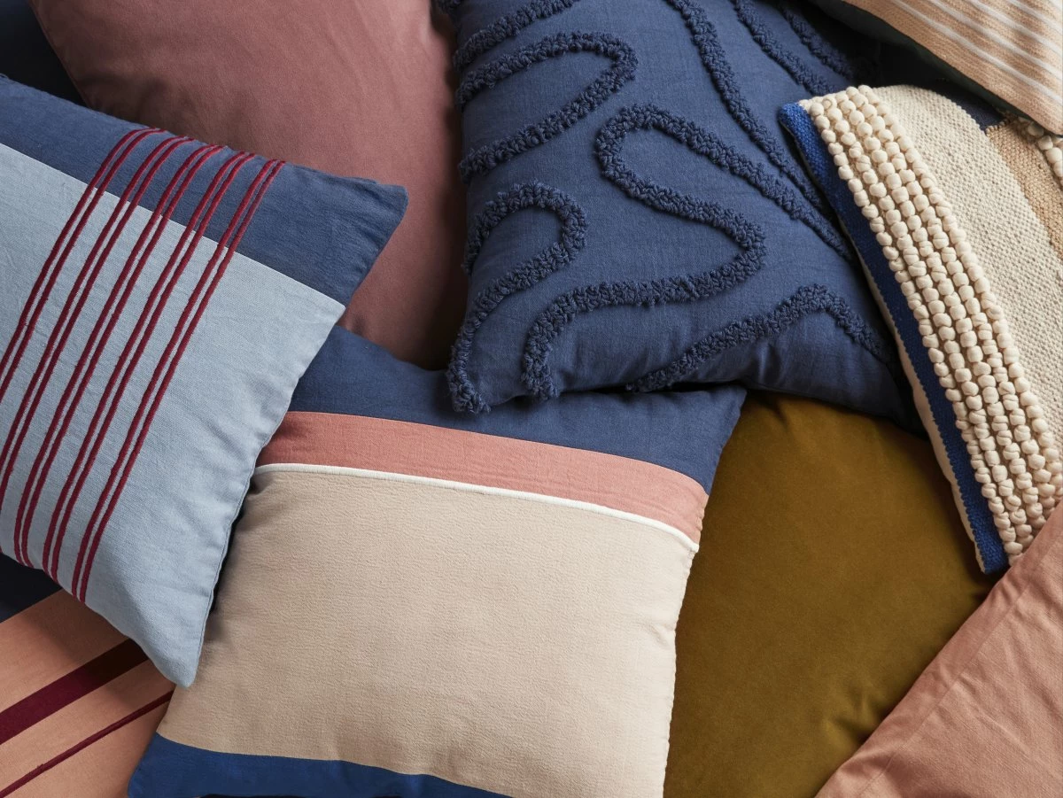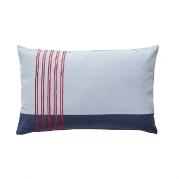 Rectangular large cushion with blue back ground, navy stripe across the bottom.