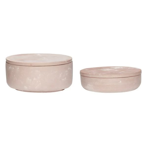 2-er Set Aufbewahrungsboxen mit Deckel in schönem dezenten Rosa gehalten. Ob zur Aufbewahrung eurer Schmuckstücke, Schmink- oder Haarutensilien oder sonstiger Schätze- die Concrete Boxen fügen sich durch modernes Deisgn und Pastellfarbe in jedem modernen Haushalt ganz wunderbar ein. Sie sind in minimalstischem skandinavischen Design gehalten Material: concrete Durchmesser: ø18xh6, ø20xh10cm