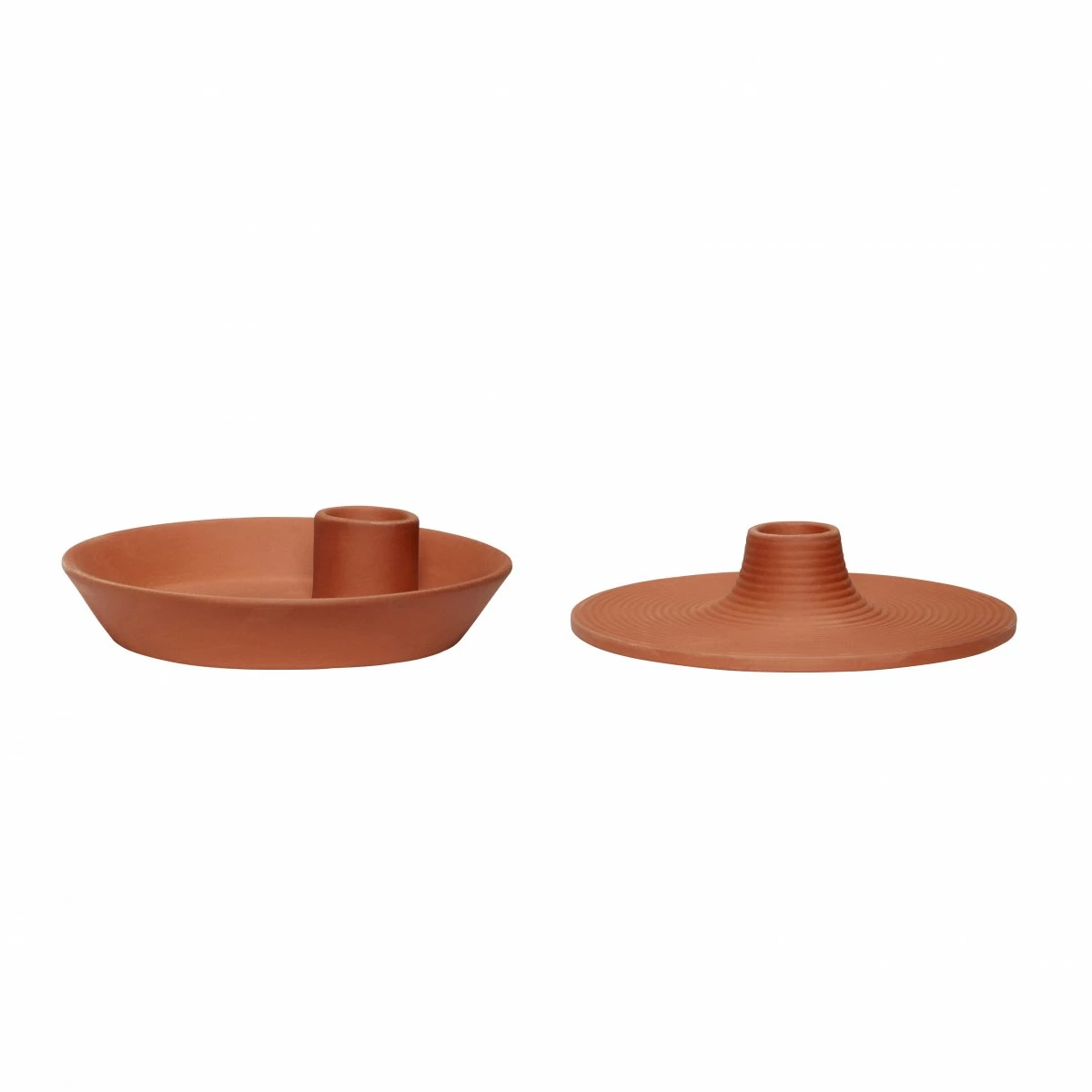 This set consists of two harmoniously combinable terracotta candle holders. Materials Porcelain Colors Pink, Terracotta Size ø 15 x h 4 cm