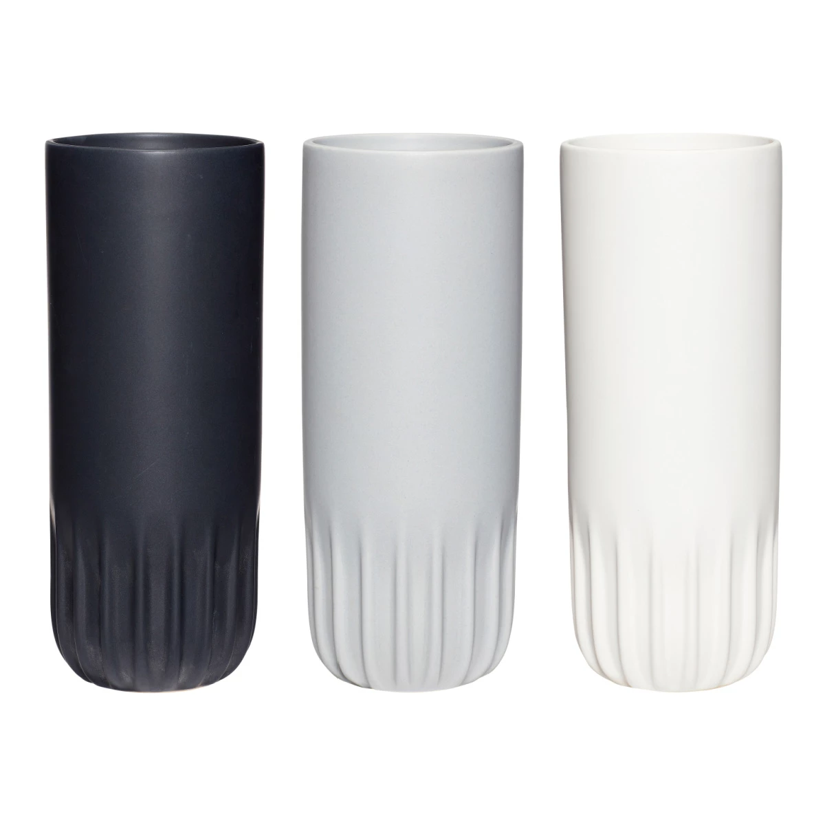 This stunning trio of ceramic, monochrome vases will blend beautifully into any style of room. Use to display your favourite cut flowers or simply as a decorative statement. Their modern, sleek lines will add interest to any area of your home whether grouped together or stood alone. One of each colour supplied (black, white and grey)