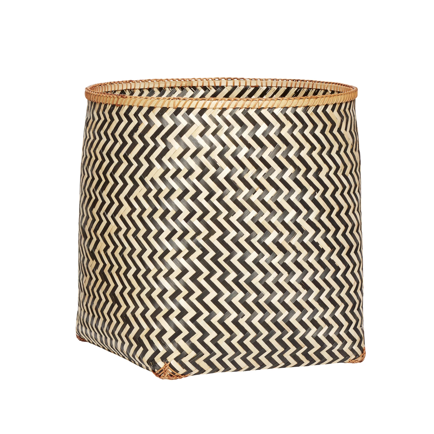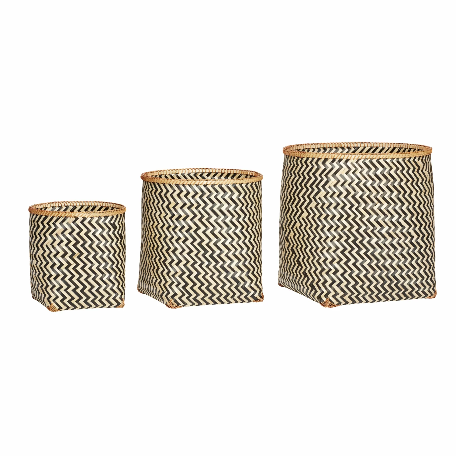 Stylish bamboo storage basket set with black and natural colour zig zag pattern from Danish design house Hubsch. These baskets are ideal for storing toys or blankets. It can also be used for big plants. Its generous size makes it possible to store lots of things away and tidy your home. Available as a set of 3 or individually.