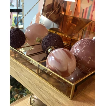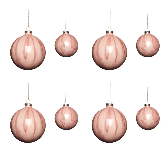 Wonderful set of eight hanging balls for Christmas tree decoration. The set consists of 8 shiny balls of two different sizes finished in a mix of pretty pink tones. They are ideal to combine with balls of tones or textures, to create variety and make the Christmas tree something personal and unique.