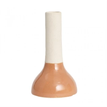 Vase with a narrow neck made of clay and glazed the lower area in bright orange. Matching with another larger format. Ideal for a floral detail.