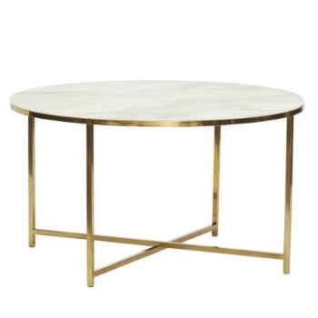 Low coffee table from Hübsch with a crossed brass footing and supporting frame, finished with tempered glass top. The glass top is fogged, showing a slight marblelling effect coming through from underneath.