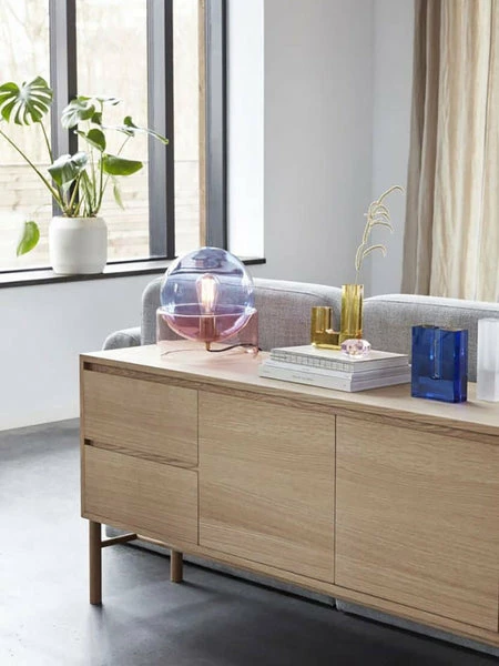 Light up small spaces with the handblown Ultra Table Lamp Rosa by Hubsch. This fun and colourful glass light is handmade in a blue and pink stained glass, and has a long black fabric cord for ease of placement.