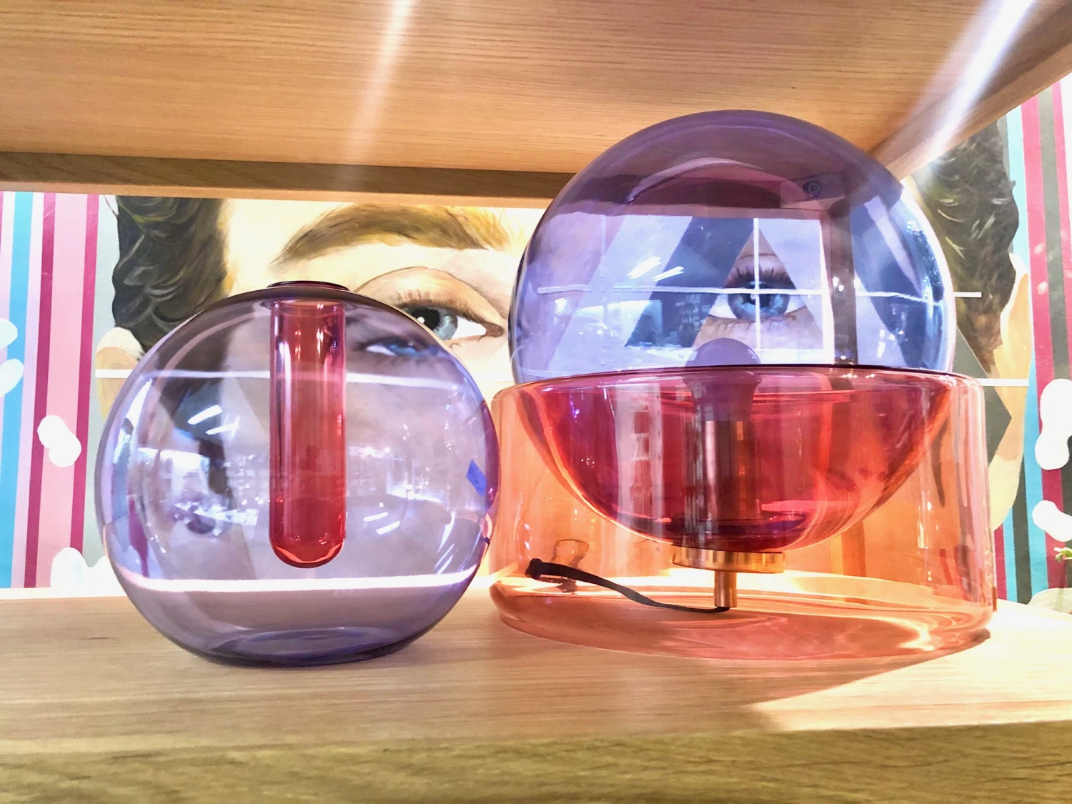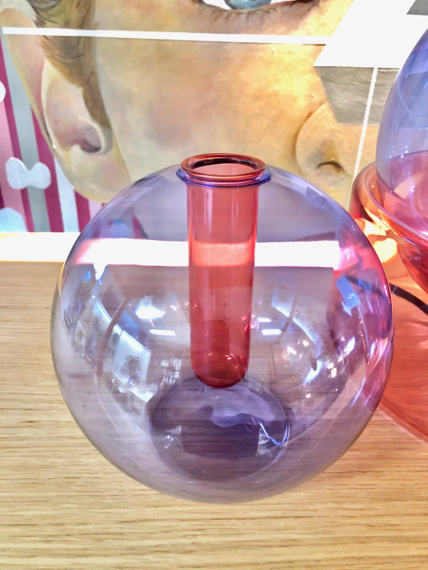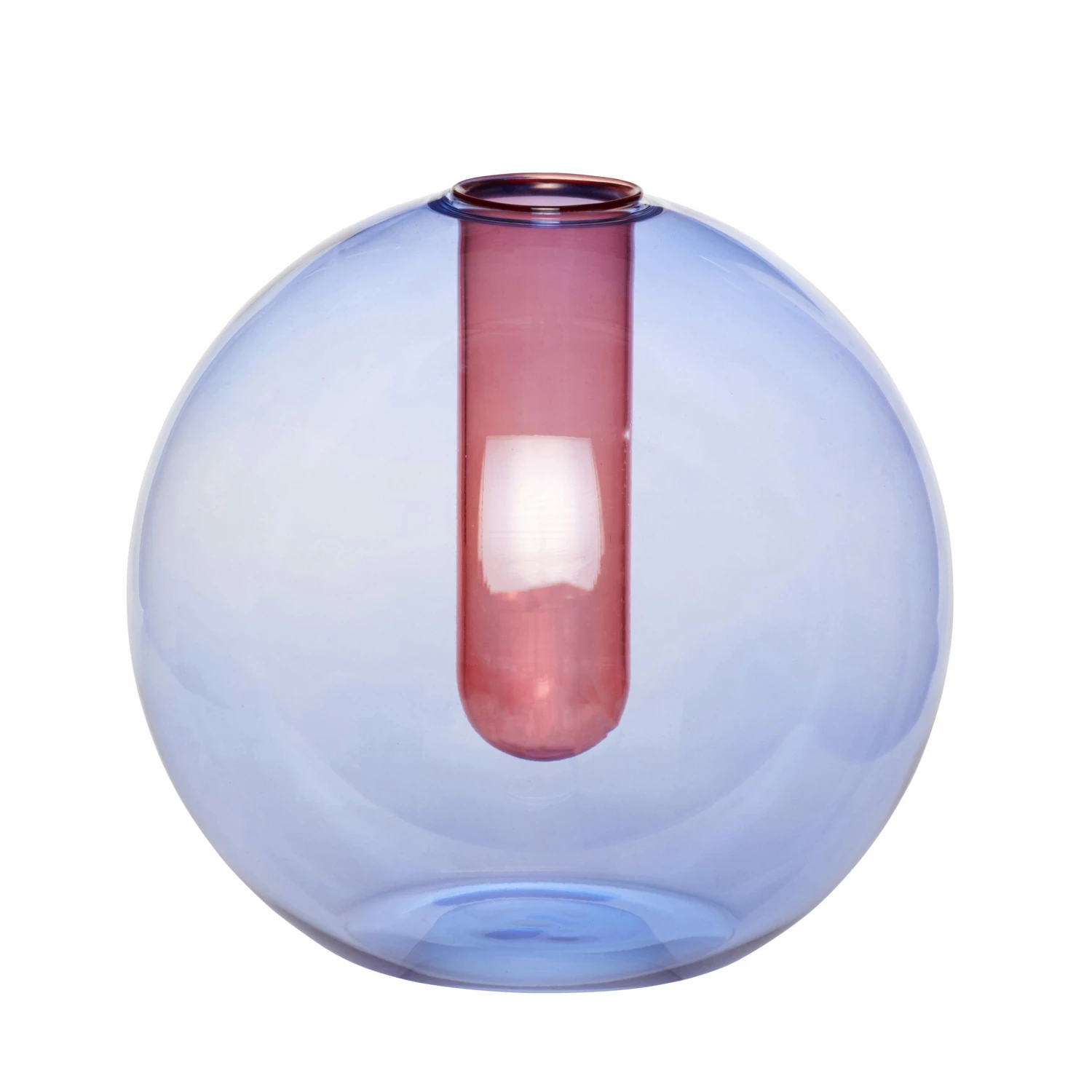 Vase designed by the Scandinavian firm Hübsch. Circularly, it has two pieces: a round and blue glass base, with a star neck on which a pink test tube is inserted, which acts as a vase. It brings a touch of color, brightness and naturalness with natural or artificial branches or flowers.