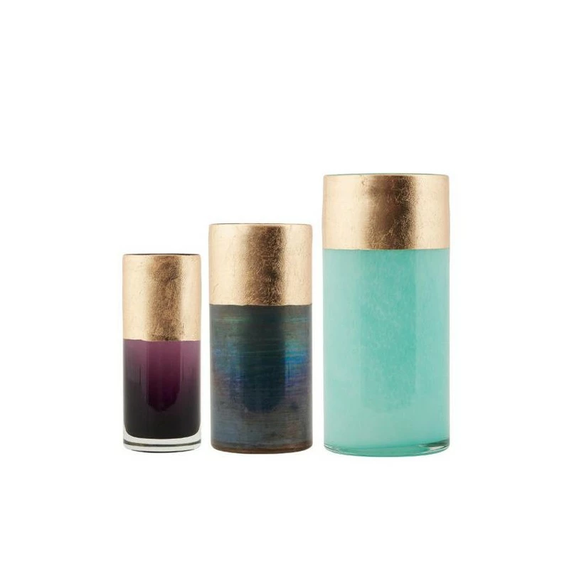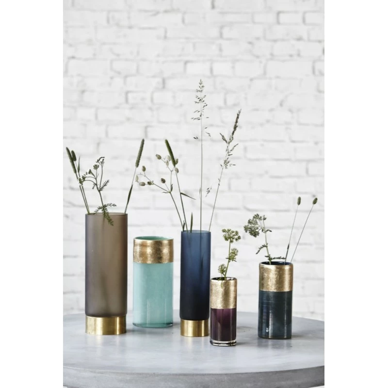 Vase Vase in water green and decorated with a top band in gold leaf. The contrast of brightness and materials make this decorative element something very special. Water resistant to complement with flowers or leaves.